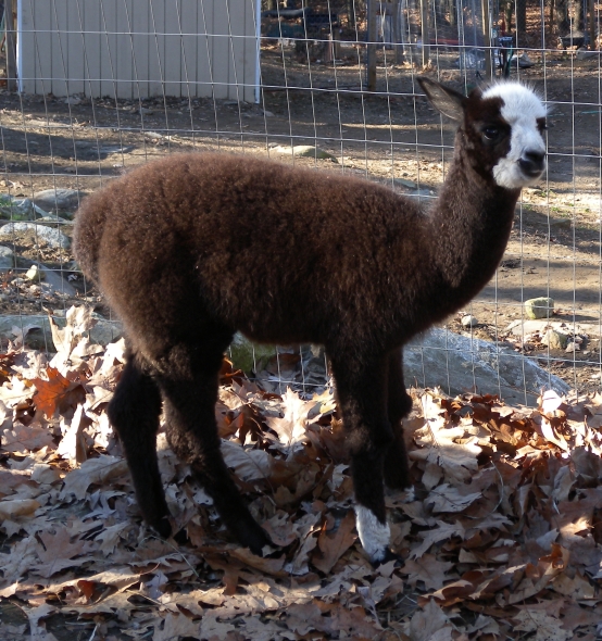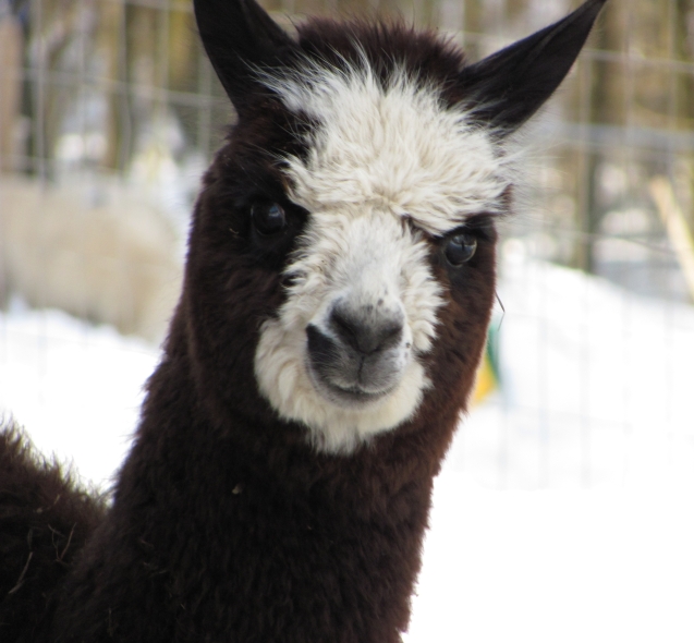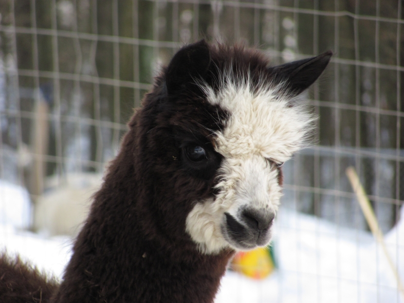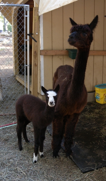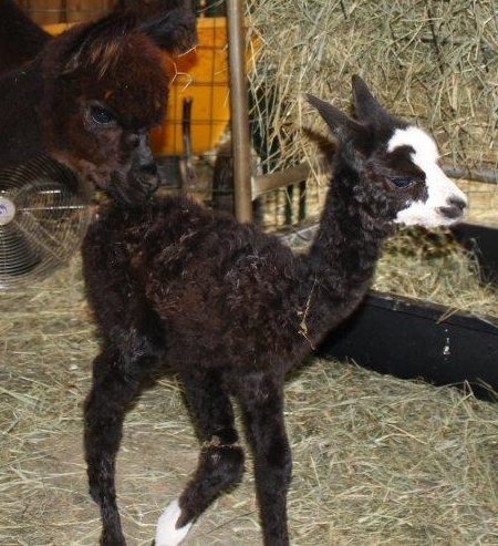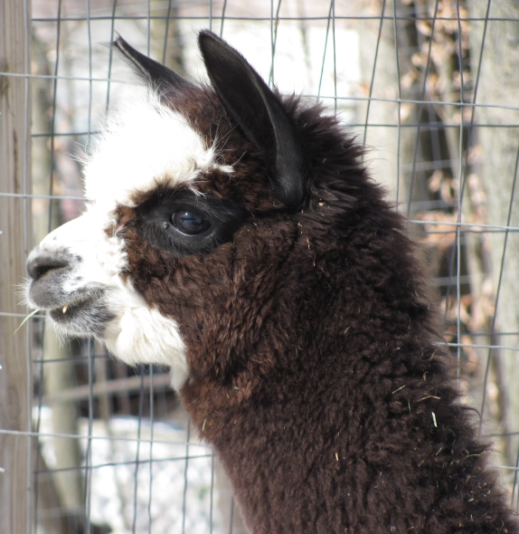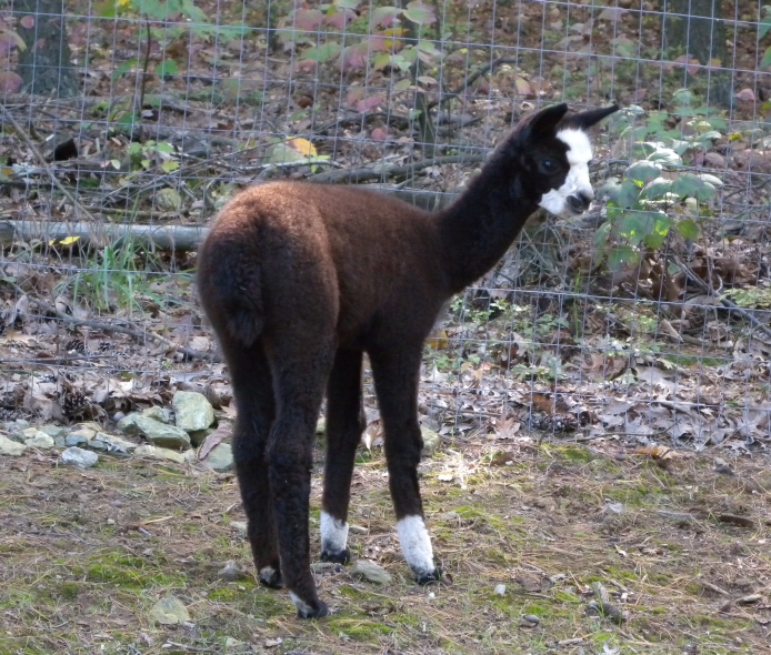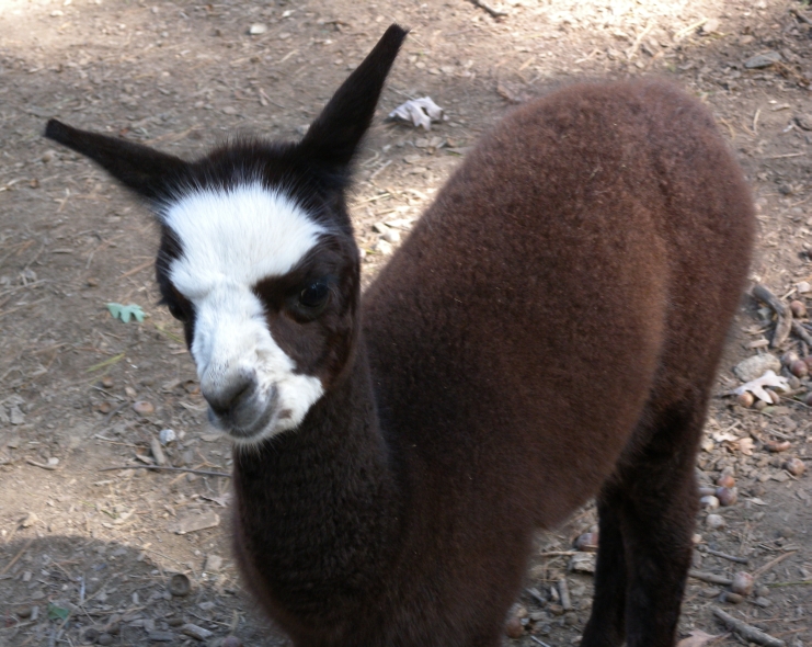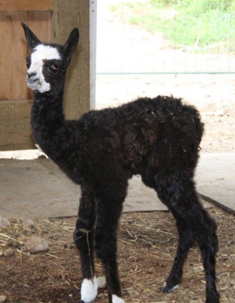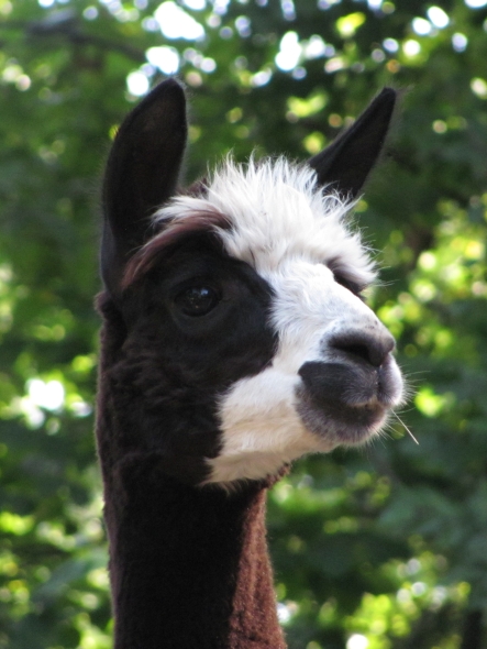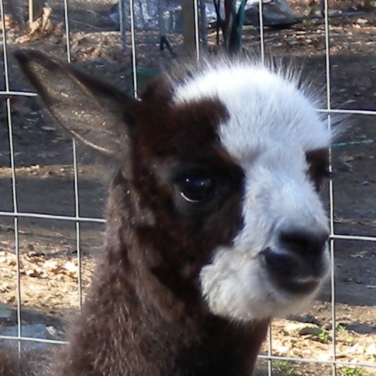 Temperment: Active and spirited. Curious to the point of bold. Resident escape artist Color (phenotype), Gender: fading true black and white adult female (Don't let the bleached tips in the photos fool you! Once she was sheared, she was a beautiful true black underneath! Although I have to say, as a fiber artist, I find the potential uses of her bi-tonal fleece to be inspiring.) Color (genotype): black / black, white spot gene Breed: Huacaya ARI#: 31893275 Sire: Great Rock Incan Prince Dam: Annie Matilda Offspring born into the Pasture Candy herd: Ancestors with 40 or more registered offspring, as of October 2010 (generations back): Peruvian Olympus (2), Brittany's Desperado (3), SA Karrington (5), Peruvian Drambuie G220 (3), Chilean Feliz Fellow (3), SA Emperado (4) Fiber description: Crimpy and wonderfully velvety soft. Soft enough that it is hard to feel it is there! Fiber stats: