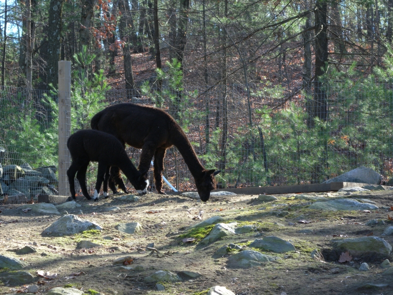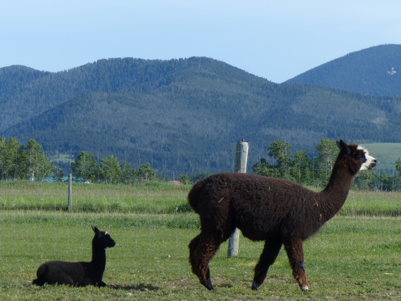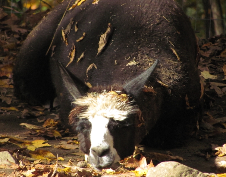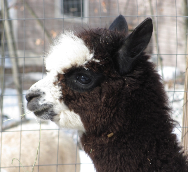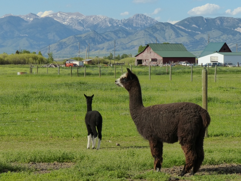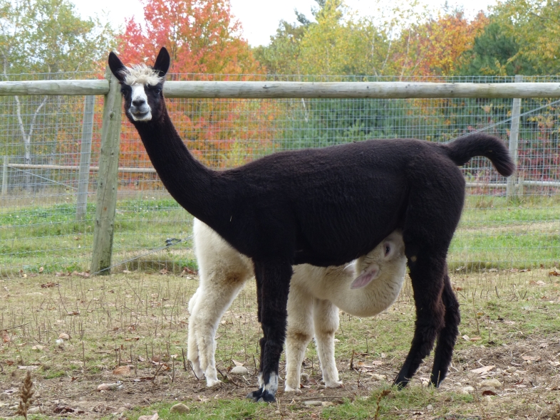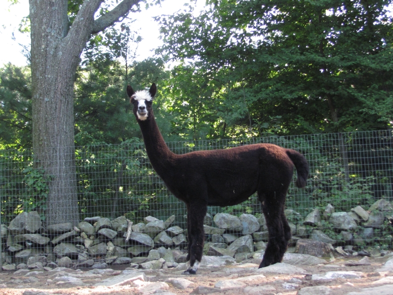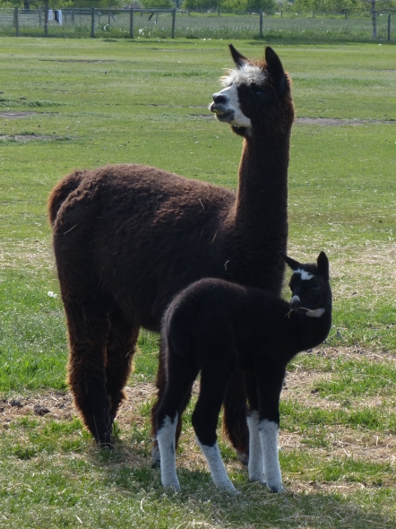 Temperment: Active and spirited. Curious to the point of bold. Resident escape artist Color (phenotype), Gender: fading true black and white adult female (Don't let the bleached tips in the photos fool you! Once she was sheared, she was a beautiful true black underneath! Although I have to say, as a fiber artist, I find the potential uses of her bi-tonal fleece to be inspiring.) Color (genotype): black / black, white spot gene Breed: Huacaya ARI#: 31893275 Sire: Great Rock Incan Prince Dam: Annie Matilda Offspring born into the Pasture Candy herd: Ancestors with 40 or more registered offspring, as of October 2010 (generations back): Peruvian Olympus (2), Brittany's Desperado (3), SA Karrington (5), Peruvian Drambuie G220 (3), Chilean Feliz Fellow (3), SA Emperado (4) Fiber description: Crimpy and wonderfully velvety soft. Soft enough that it is hard to feel it is there! Fiber stats: