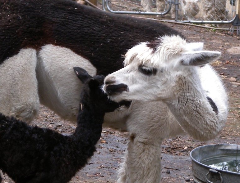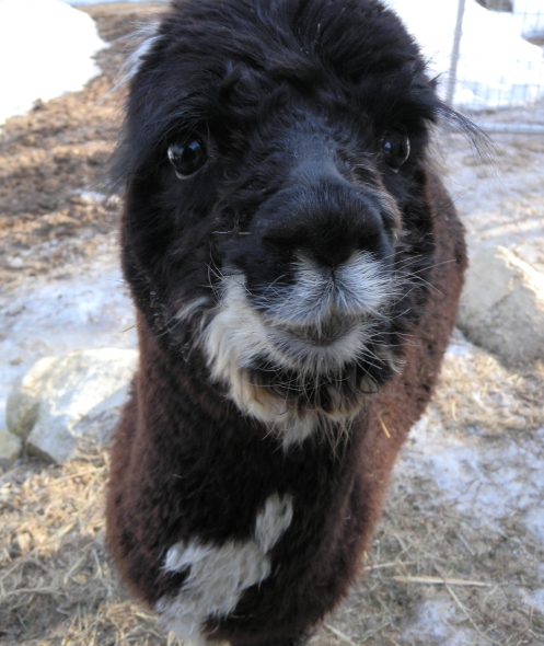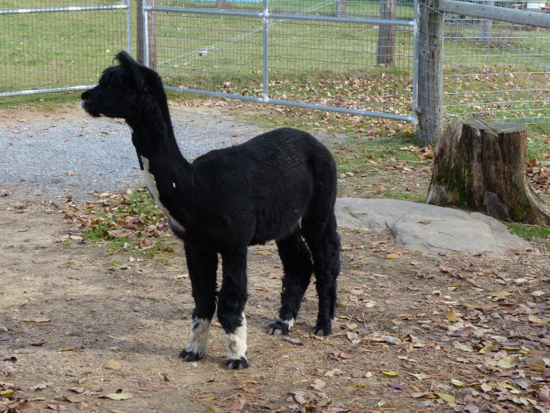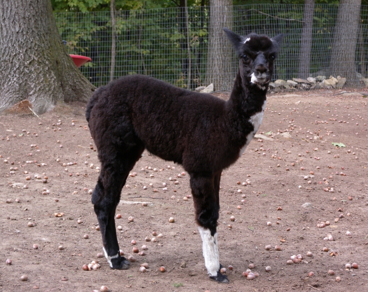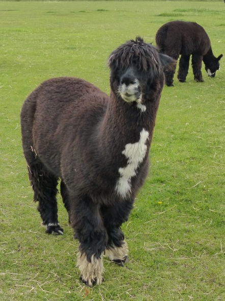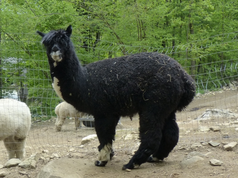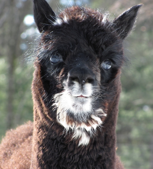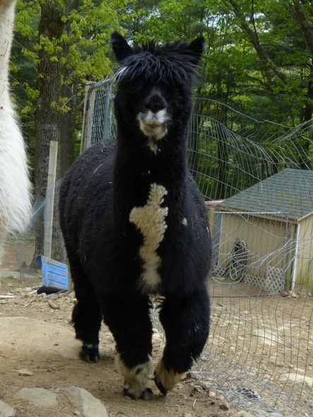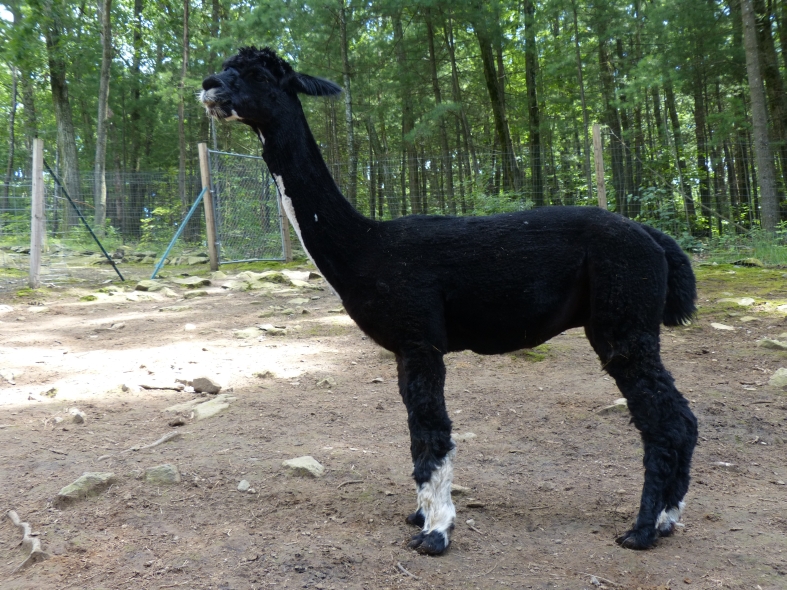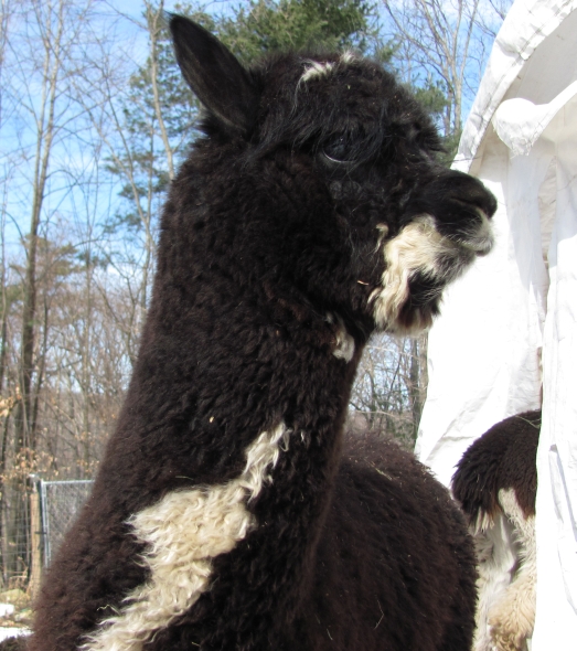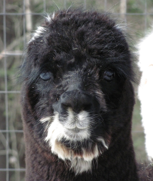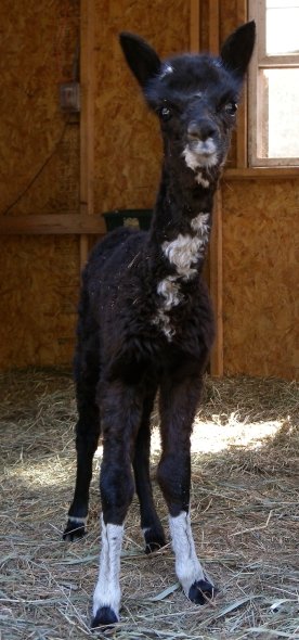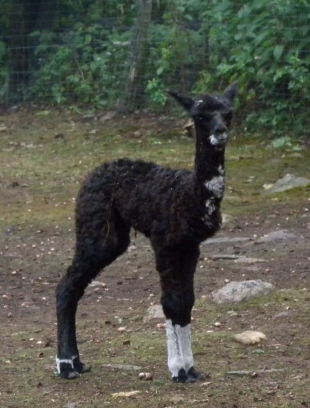Temperment: very sweet Color (phenotype), Gender: non-fading true black and white adult male Color (genotype): true black / true black, white spot gene Breed: Huacaya ARI#: 31866804 Sire: Othello's Running Bear Dam: TKA Zoey Ancestors with 40 or more registered offspring, as of October 2010 (generations back): Pperuvian Guellermo G4546 (4), Peruvian Camilio G4561 (4), Peruvian Ion S221 ALOA (3), Peruvian White Out (5), C4 Merrill G211 (4), Peruvian Fuego G226 (5), SA Karrington (5), Ppperuvian Dante (4) Fiber description: Strong fiber. Nice handle, with an intriguing cool slick feel, and exceedingly bright (see fleece photo!). Fiber stats:
